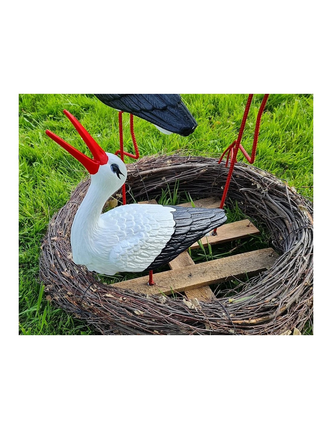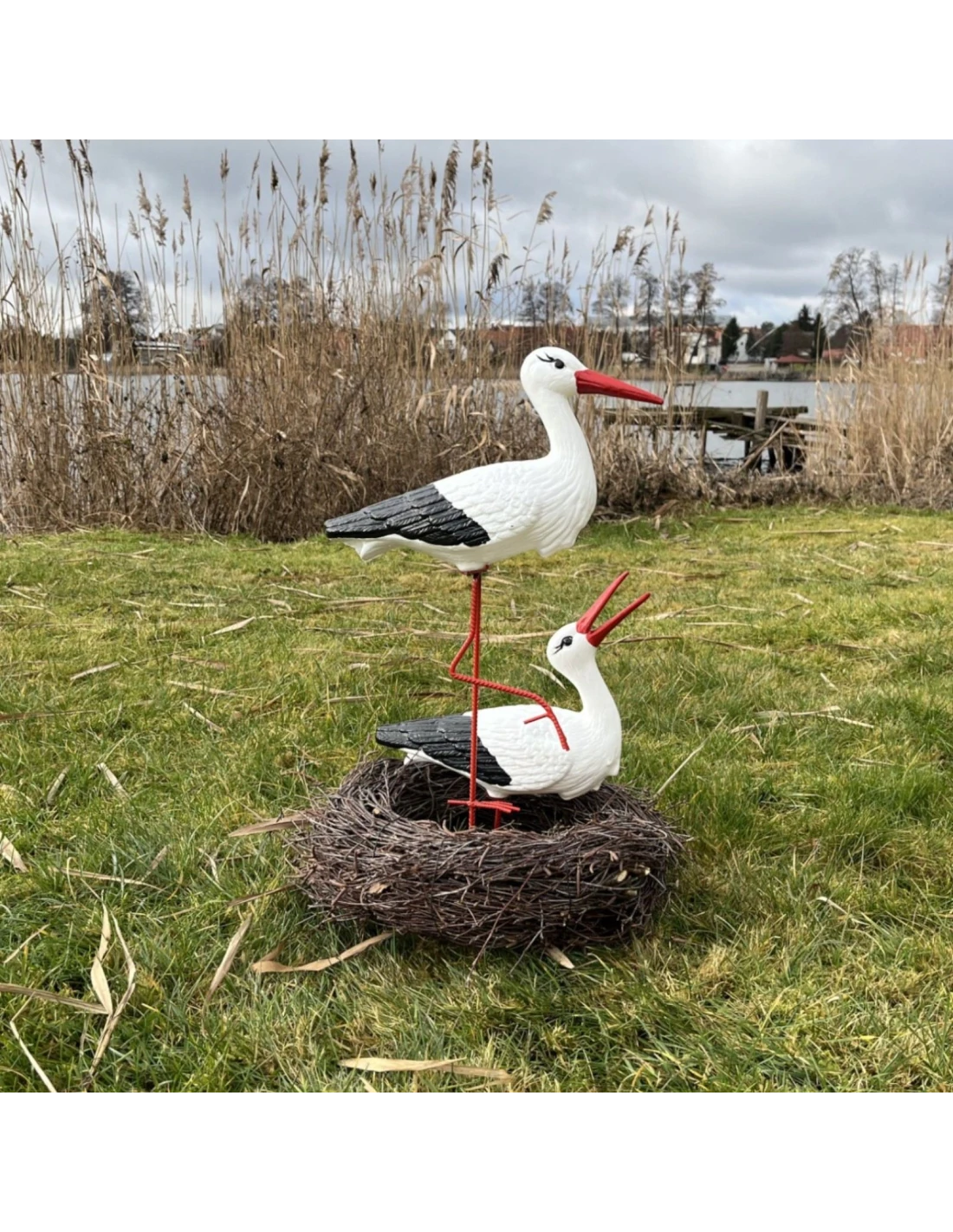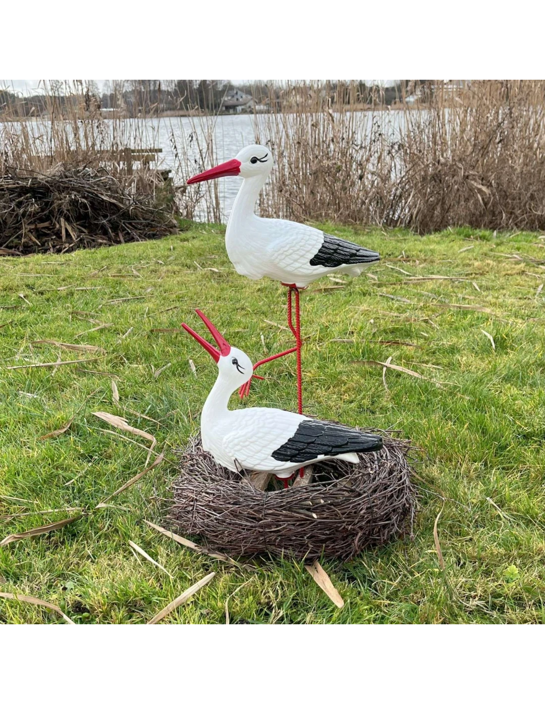 • Construction robuste – cigognes en polyuréthane résistant aux chocs, pieds en métal, et nid en branches de bouleau renforcées par une base en bois.